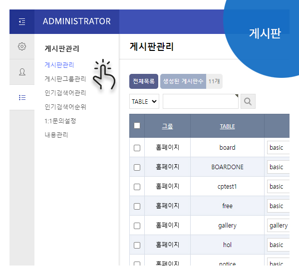 게시판을 추가하거나 목록에서 게시판의 설정을 일괄 수정할 수 있습니다